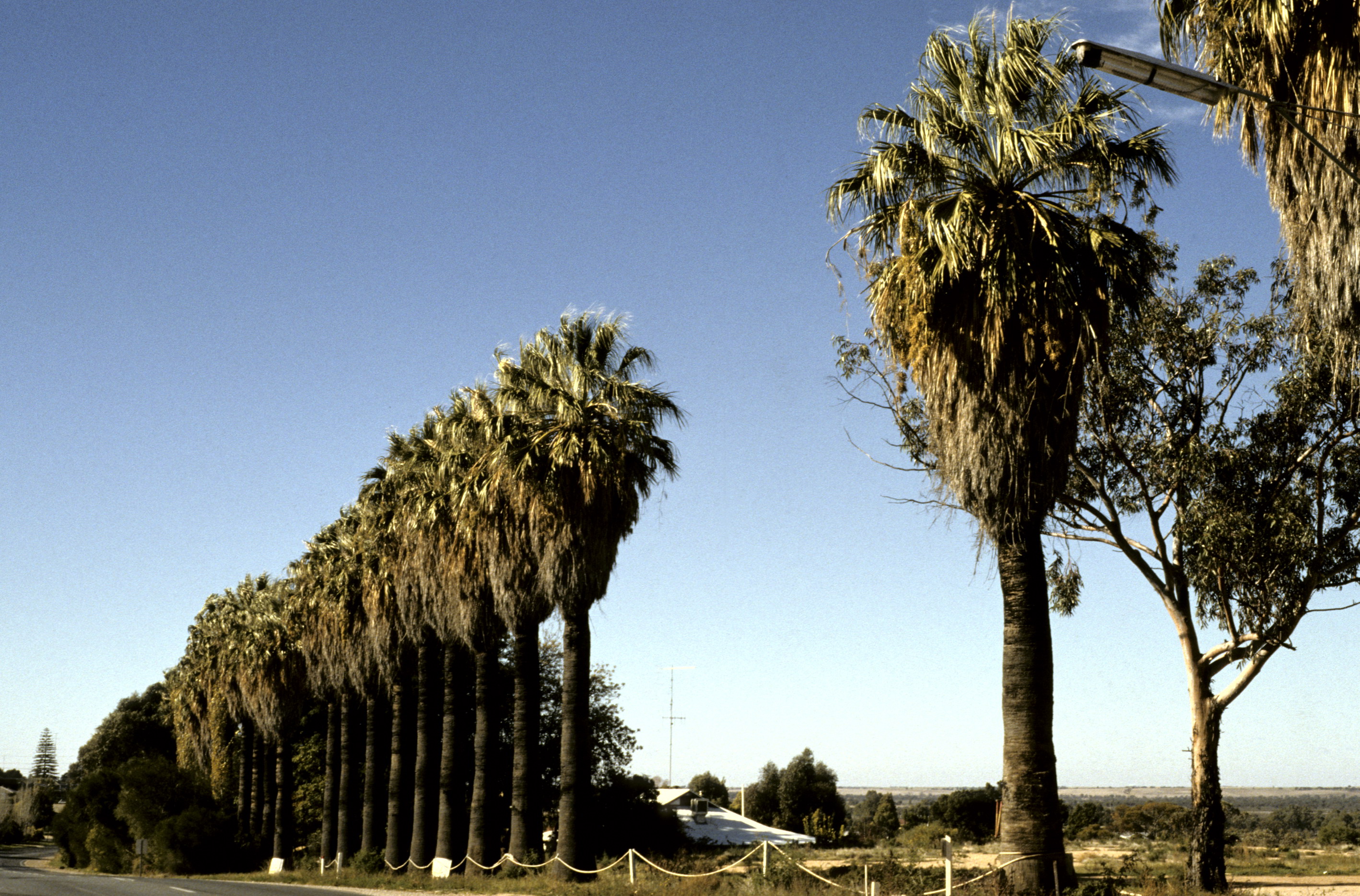 The row of 47 Fan palms, a local landmark, flanks the Sturt Highway and the original irrigation channel W of Berri Barmera. The trees were propagated from seed brought to Australia by the Chaffey Brothers in 1887. Thus the row is of historic significance and high landscape value.