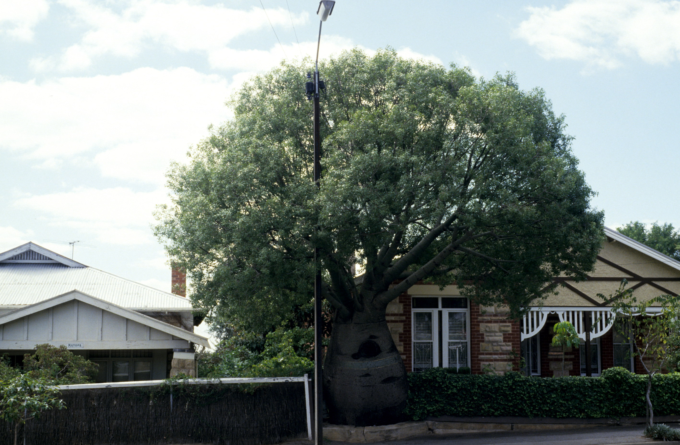 The Queensland bottle tree is an unusual planting for Adelaide. This particular tree growing in the front fence at 440 Regency Road is a striking local landmark.
